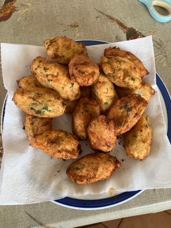 So when I saw this recipe to test, I thought it would give me the opportunity to work with salted cod. And I’m so glad I did. Although these fritters were filling, they were also light and very tasty. You do have to start 24 hours in advance if you have a thick piece of salt cod, but most of that time, the cod is simply soaking and there’s not much to do.
