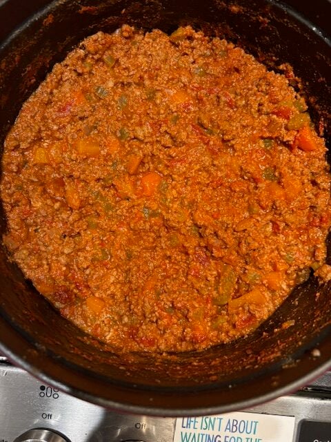 Unlike most commercial jar sauces, this sauce doesn’t have a strong tomato taste. I love that. It is pure, hearty, stick-to-your-ribs comfort food.